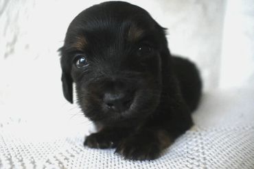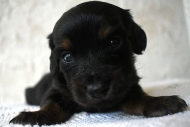 Plum is our last available boy, and he’s expected to be a long‑coat black and cream. While he grows, we’ll be working on all the important basics housebreaking, crate training, grooming, manners, and overall socialization.