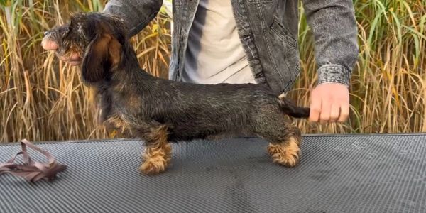 Gizela is our mini wirehair Dachshund, a tiny rabbit/mini girl weighing just 7 pounds. Her color is wild boar, and her personality is every bit as bold spunky, fun, and always ready for an adventure. She came to us all the way from Poland and has already been to several shows, where she’s doing wonderfully. Gizela brings so much energy, joy, and character to our program.